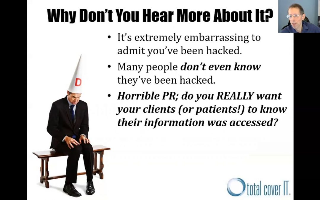 Now you ask yourself: well i never. I i don’t hear any more about that. I only hear about jp morgan. I hear about facebook hear about microsoft. I don’t care about small businesses being hacked well. Here are some reasons they don’t one thing: it’s very embarrassing to admit it and number two.